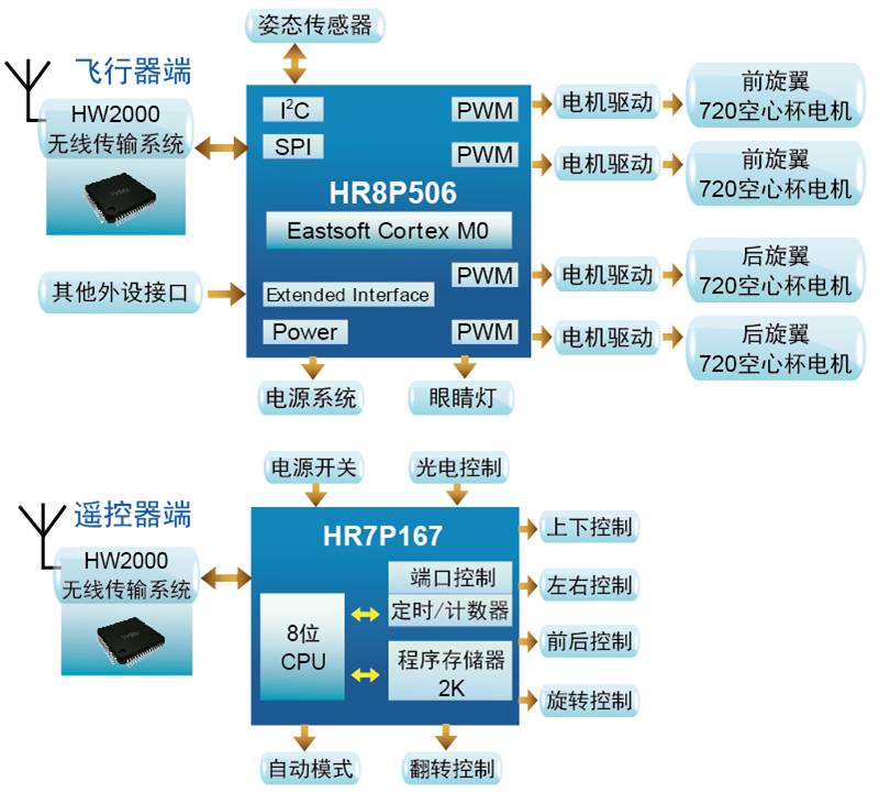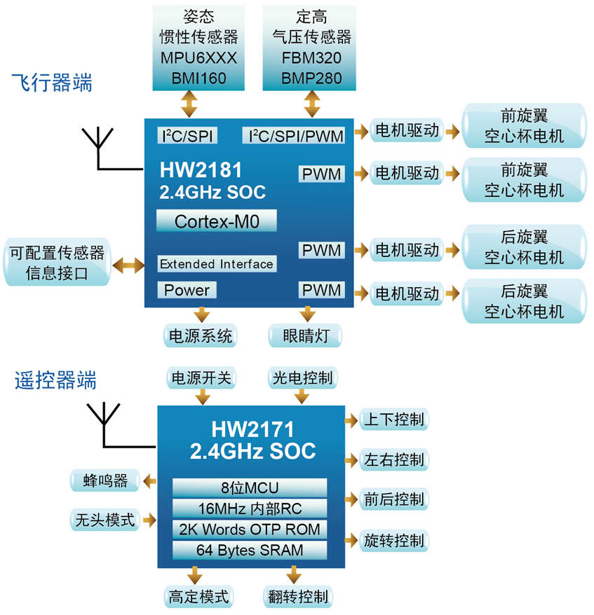 2 颗SOC芯片方案 | 飞行器端HW2181,遥控器端HW2171 |