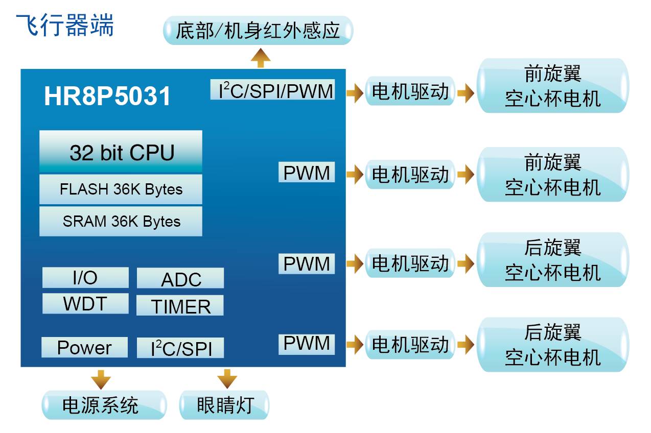 遥控型四轴功能说明: ① 垂直、俯仰、翻滚、偏航、前后、侧向等6种基础飞行模式 ② 四通道遥控器灵活控制 ③ 2.4GHz多信道跳频遥控协议 ④ 一键翻跟斗 ⑤ 多彩眼睛灯 手感应型四轴功能说明: ① 垂直、侧向、前后、偏航等4种基础飞行模式 ② 侧飞感应飞行,自动控制飞行器转向 ③ 一抛即飞,无需遥控操 ④ 底部红外感应,底部遇到障碍自行飞高 | 特征说明: ① 1颗、2颗SoC、4颗低成本高性能 IC可选 ② 一站式套片供给 ③ 整体解决方案参考 ④ 完整开发工具链 ⑤ 快速高效技术支持 |