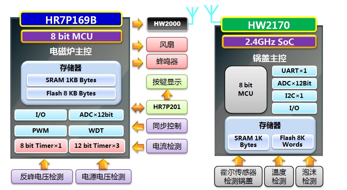 ①低成本、高性能SoC芯片 ②锅盖手柄自动检测温度和泡沫