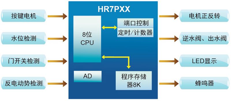 功能说明: ①电机转速可调节。 ②支持水位检测。 ③进出水自动控制。 ④电机堵转保护。 ⑤LED灯指示工作状态。 | 特征说明: ①掉电数据可存储在芯片中。 |