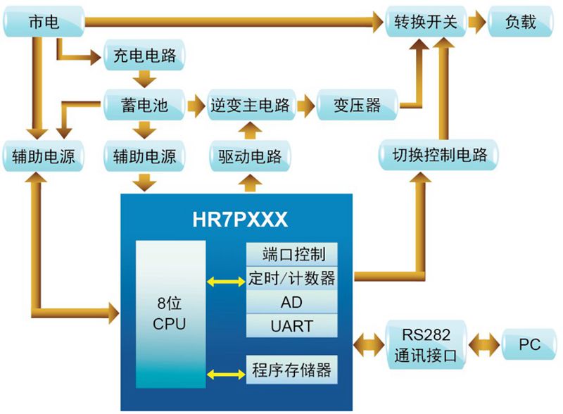 功能说明: ①市电与UPS同步转换。 ②通过PWM闭环调节输出电压。 ③蓄电池充电,智能调节。 ④通过串口实现与PC通讯。 | 特征说明: ①体积小。 ②电源转换效率高。 ③具有较完善的自我保护系统,如:电池电压较低紧急警告、过流和短路保护、放电结束保护等。 |
