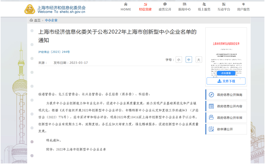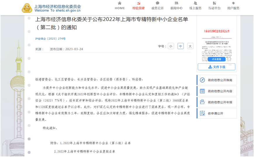 根据《上海市优质中小企业梯度培育管理实施细则》(沪经信规范〔2022〕8号),经专家组严格评审和综合评估,正式公布了通过审核的企业名单。开元官网开元(中国)登录入口成功认定为“专精特新”中小企业与“创新型”中小企业。