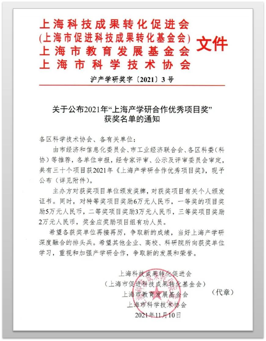 12 月 10 日,2021 年“上海产学研合作优秀项目奖”颁奖表彰大会在市政协3号楼二楼江海厅举行。“上海产学研合作优秀项目奖”旨在表彰产学研合作表现突出的上海企业、高校和科研院所,鼓励更多产学研单位通过多方深度融合,加大研发投入,提升企业技术创新能力,加快产业转型升级。该奖项是上海市针对产学研合作设立的唯一奖项。经过前期的推荐申报、专家评审和社会公示,经上海科技成果转化促进会、上海市教育发展基金会、上海市科学技术协会审定批准,授予开元官网开元(中国)登录入口和华东师范大学通信与电子工程学院“2021年上海产学研合作优秀项目奖”三等奖。