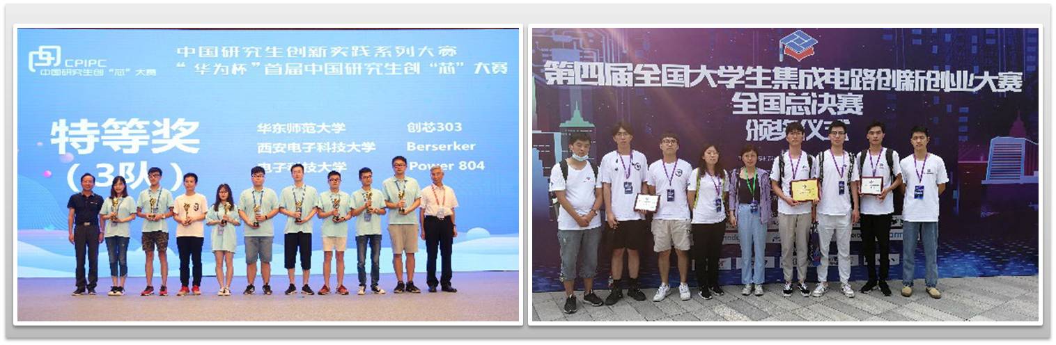 在校企合作,资源互补联合培养学生过程中,学生的创新、实践能力大幅提升。近5年,共计有100余名学生参加国家级集成电路学科竞赛,共荣获全国一等奖7项。“华为杯中国研究生创芯大赛”,全国第一名特等奖1项,全国一等奖3项;“全国大学生集成电路创新创业大赛”连续四年获全国一等奖。