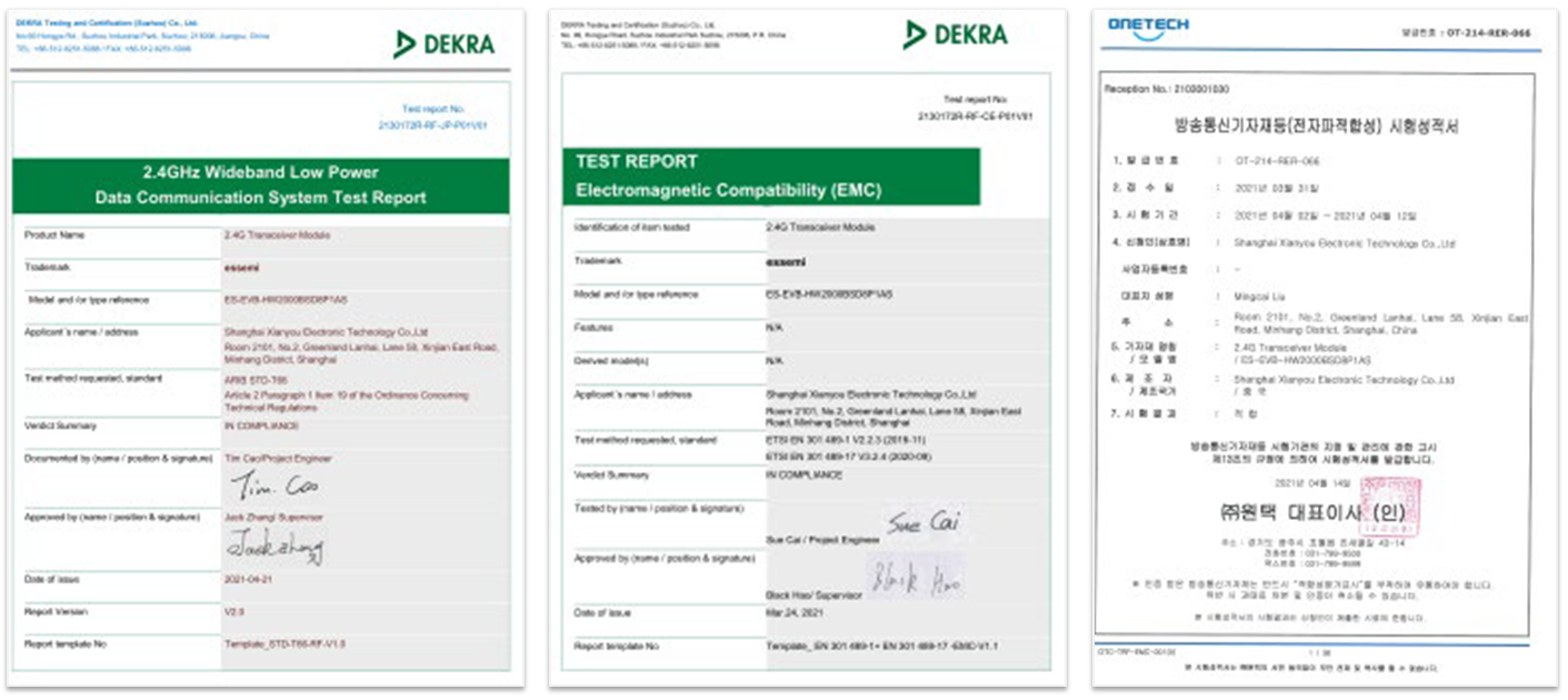 研发的2.4GHz获得海外认证,包括:欧盟CE-EMC、CE-RF、CE-Safety,韩国KC,日本MIC认证,台湾地区NCC认证。蓝牙产品获得SIGBQB认证。Sub-1GHz产品获得无委会认证、国网计量中心认证、Wi-SUN等认证。