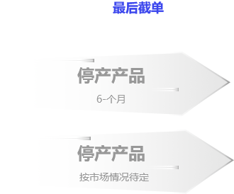 • 基于生产或行业市场变化的考虑,当产品不建议在新的项目中使用时,我司会将长期供货产品转为预停产产品。转入正式停产限用产品前会有6-12个月的缓冲通知期,以利客户处理与应变。6-12个月后,该产品会转入停产产品。列入预停产的产品类别,该类产品仅限定于继续提供给目前使用该产品的既有客户。